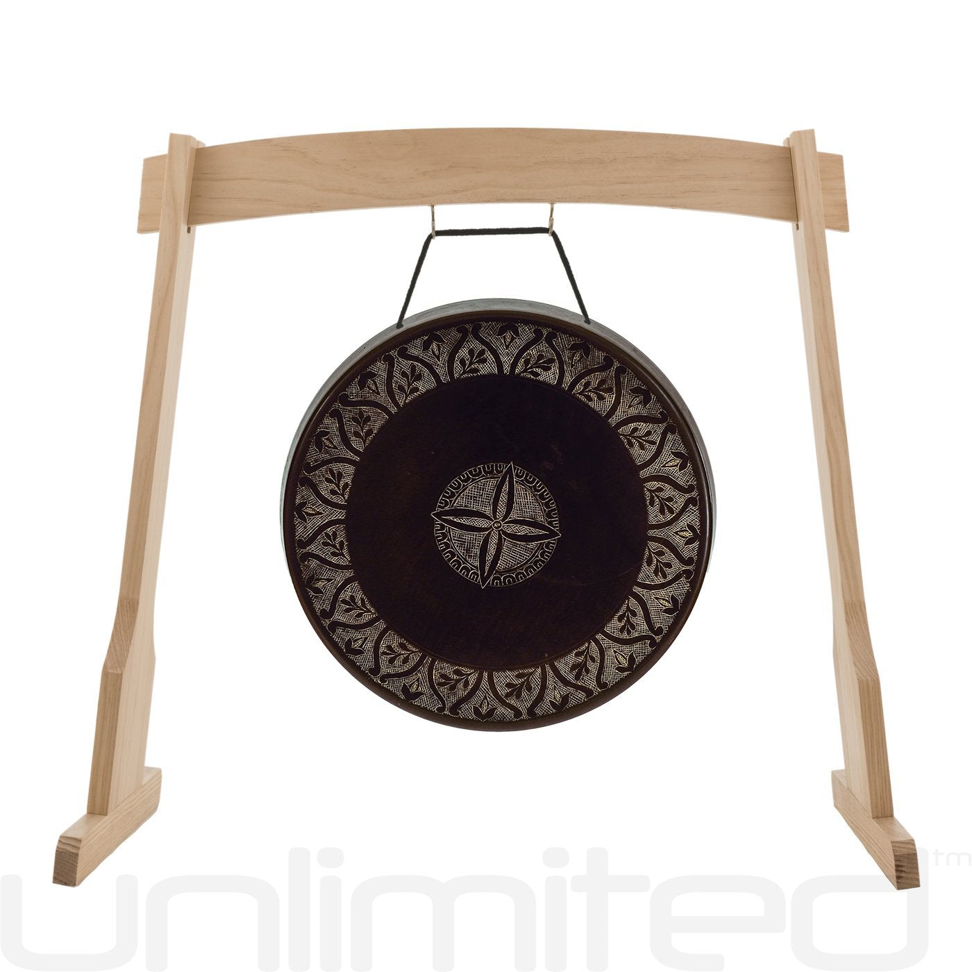 The Moksha Joe Gong Stand (in black) is a classic, simple design for 14" gongs. Clear lines of solid workman- or woman-ship make this stand a perfect fit for any room or office or table-top.