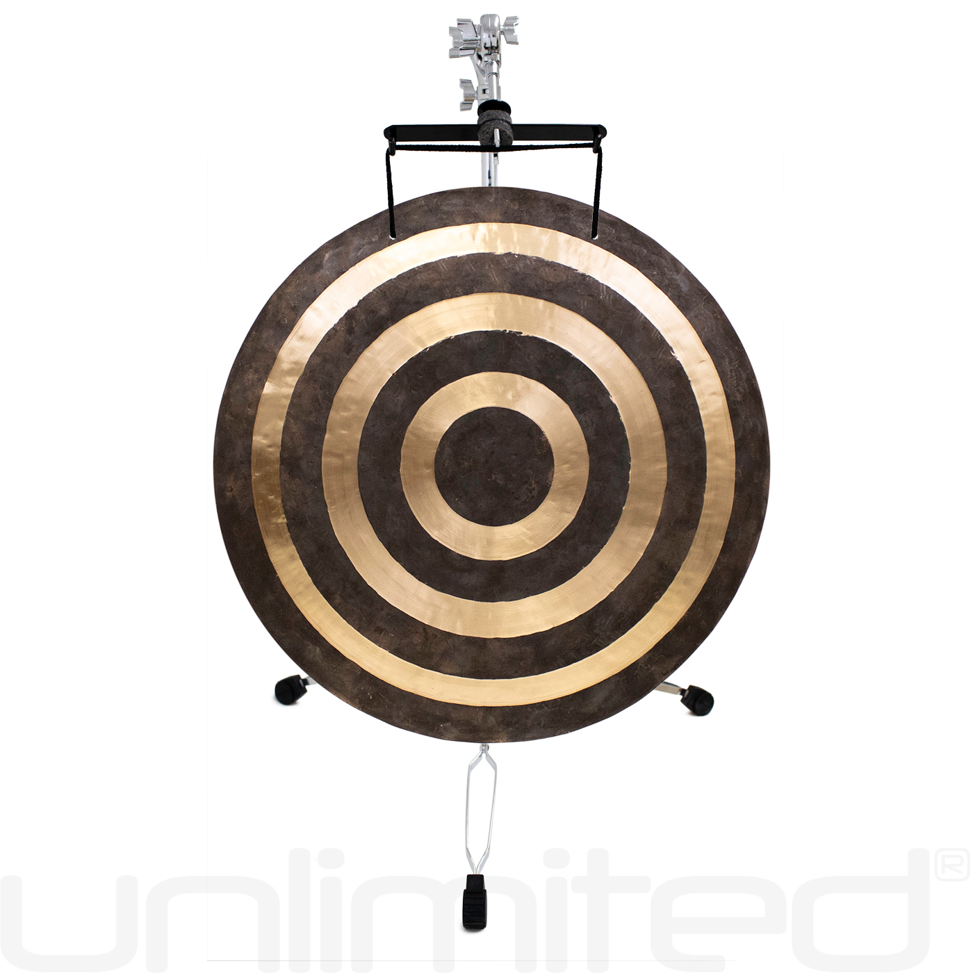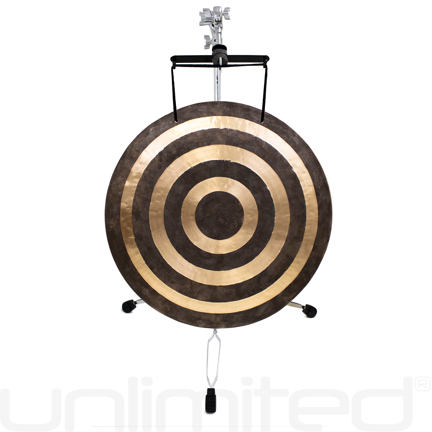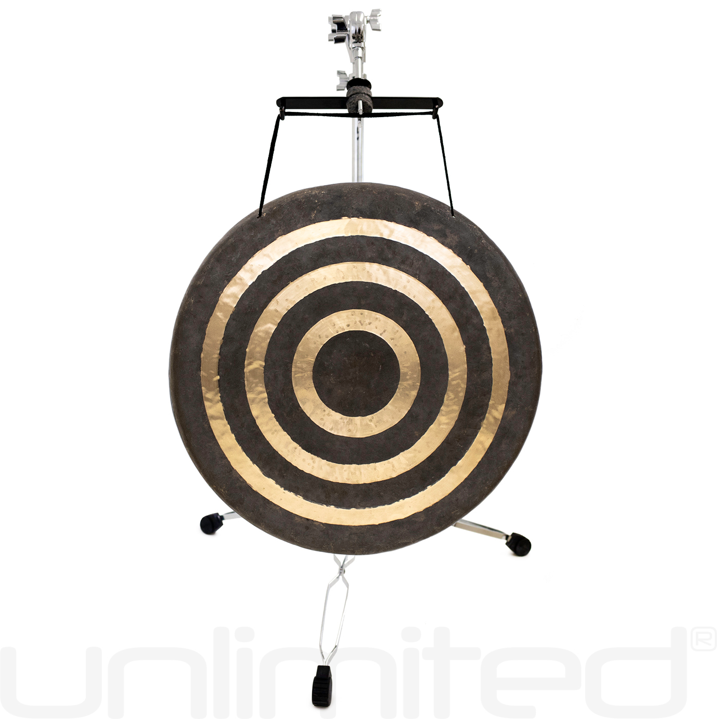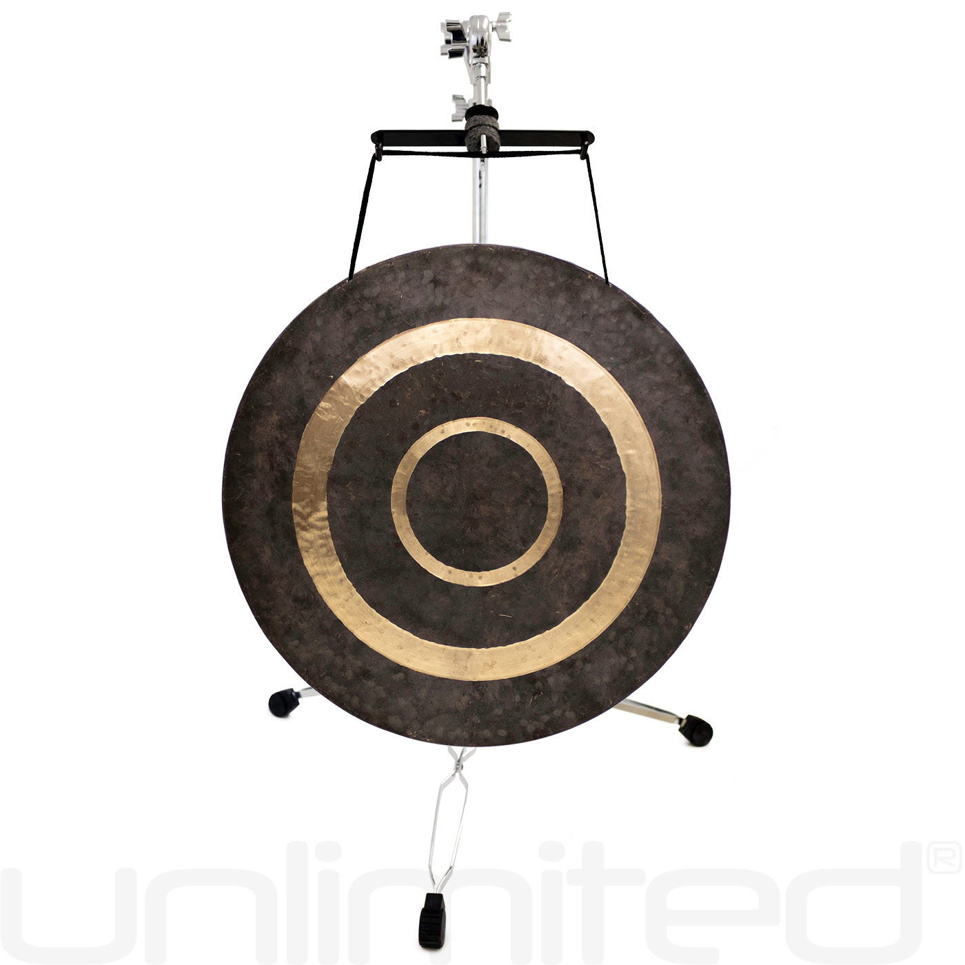 The Chau Gong is iconic in appearance. It is what many people see in their mind’s eye when they think of a Chinese Gong. The bull’s-eye design is created by the metal lathing between the rim of the gong and the center. The Chau Gong will start deep, and is helped by the rim on the edge. The lathed band allows for a good, balanced crash of overtones when the volume is built.