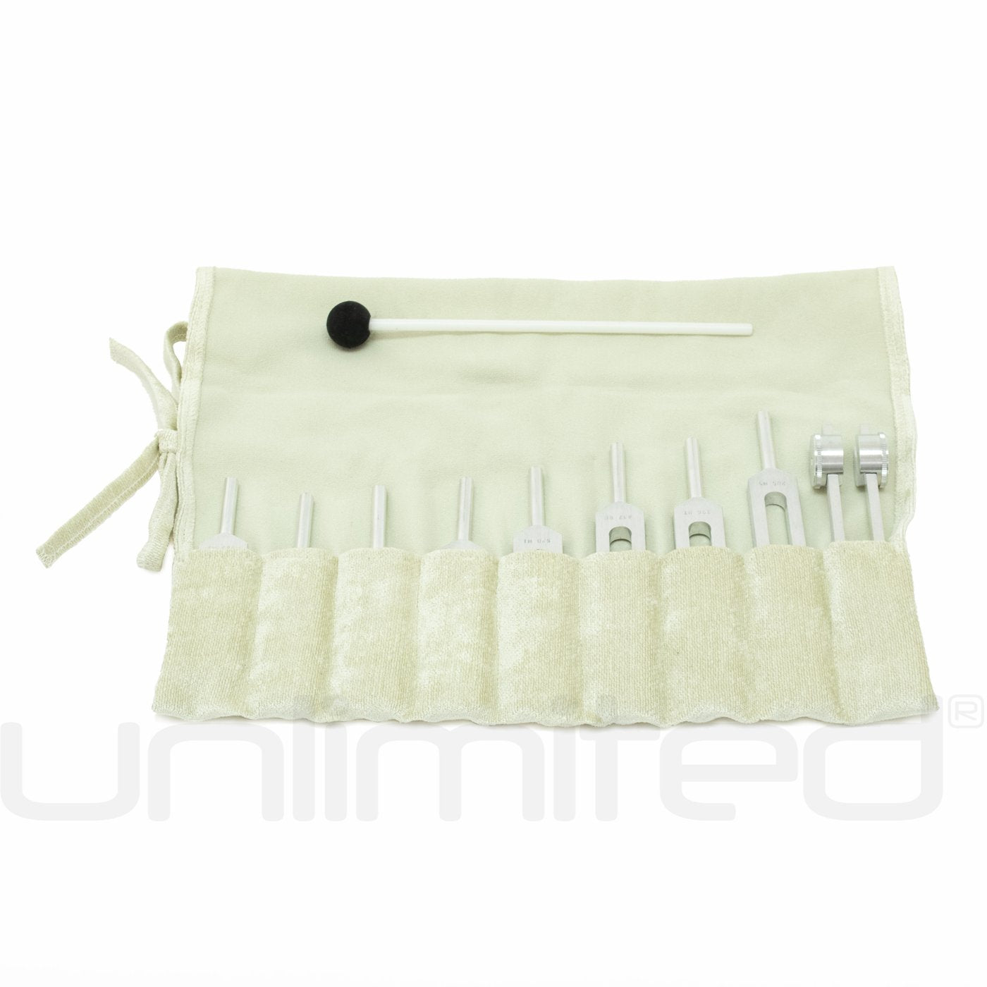 This listing comes with a set of 9 tuning forks, mallet and a pouch for storing and carrying.