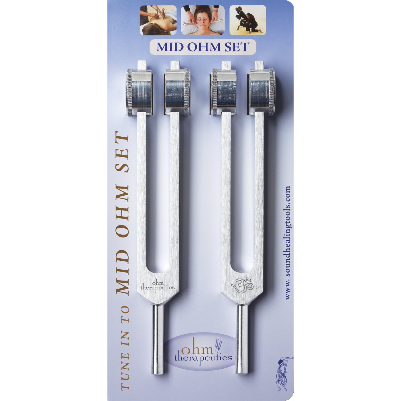 The Mid Ohm Tuning Set includes two Mid Ohm Tuning Forks, plus 6-panel instructional card with photos showing how to correctly hold, activate and apply tuning forks, featuring Spinal Treatment (Hua Tuo Jia Ji points).