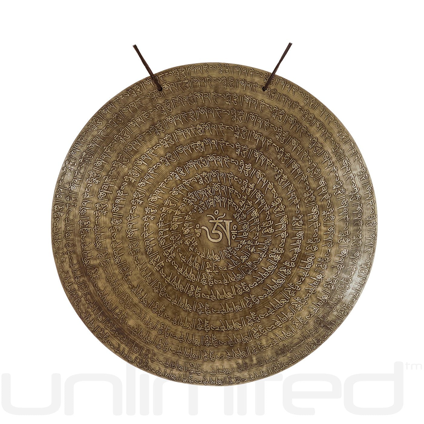 On the face of Om Mani Pamde Hum Gongs, artisans have etched the Om Mantra. This mantra invokes the embodiment of compassion.