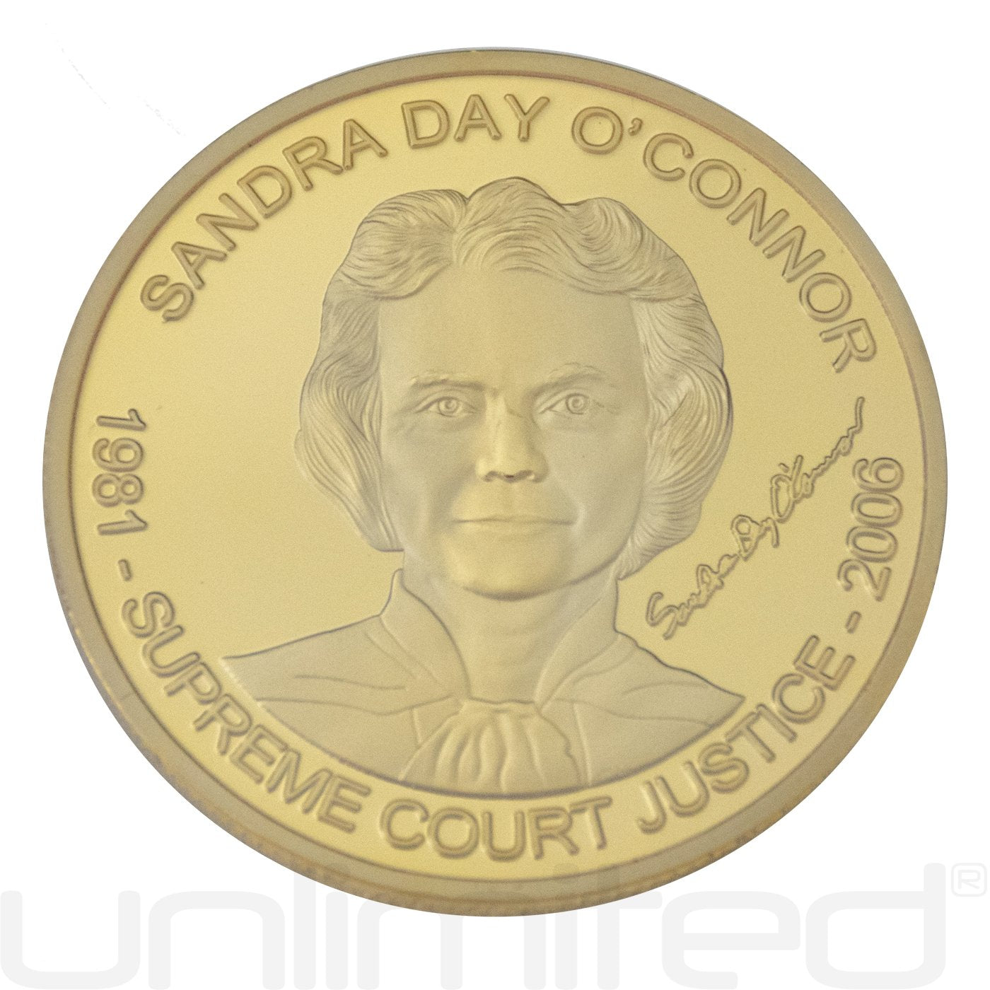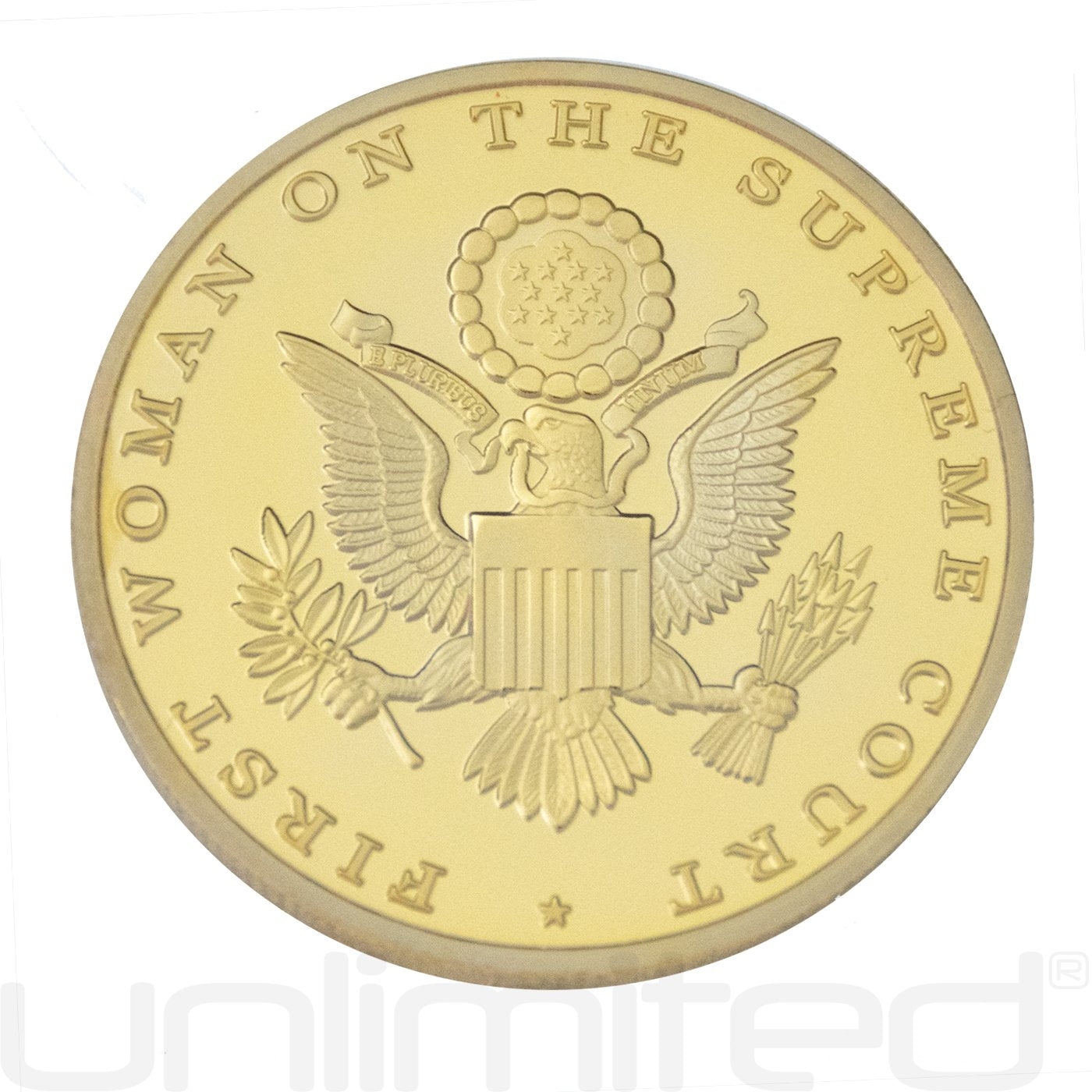 The front of this coin has the image of Supreme Court Justice Sandra Day O'Connor. Arched around her is her name, and her vocation Supreme Court Justice, with the years she served. She was the 1st Woman to be appointed to the Supreme Court. (Did you know that 96.5% of the USA Supreme Court Justices have been men? Yep.) On the back of the coin is the Great Seal of the United States, and the arched words "First Woman on the Supreme Court" commemorating her place in history. Celebrate her legacy of work and service with this coin.